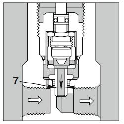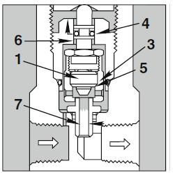 Gdy ciśnienie w instalacji urośnie poza ustalony poziom ciśnienia zadziałania, siły w obszarze 6 rosną, przesuwając sprężynę. Umożliwiają w ten sposób dalszy ruch ku górze ogranicznika grzybka, co w efekcie powoduje podniesienie samego grzybka (1) i odsunięcie go od o-ringu, do którego był dociśnięty. Prześwit zaworu (7) otwiera się i umożliwia ujście medium.