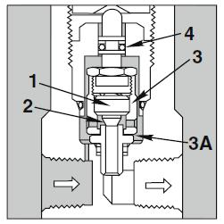 W pozycji „zamknięty” grzybek (1) jest dociśnięty do prześwitu zaworu (2) przez sprężynę i uszczelnienie. Nacisk reguluje ogranicznik grzybka (3), którego dolna krawędź znajduje się na ramieniu średnicy prześwitu zaworu w punkcie 3A. Gdy ciśnienie w instalacji rośnie do ustalonego poziomu ciśnienia zadziałania, zanim je osiągnie, ogranicznik grzybka (3) przesuwa się w górę pokonując tarcie o-ringu (4) – gwarantuje to wyjątkową dokładność zadziałania zaworu w momencie, gdy finalnie ciśnienie osiągnie ustalony poziom zadziałania.
