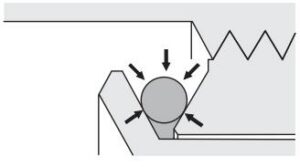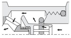 Podczas gdy ciśnienie w instalacji zaczyna powoli spadać o-ring automatycznie ustawia się w pozycji kontaktowej ze stożkową, metalową powierzchnią grzybka i siedzenia zapewniając całkowitą szczelność zaworu. - ZAMKNIĘTY