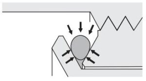 Stożkowa, gładka powierzchnia grzybka uszczelniając wywiera nacisk na o-ring. Im większy nacisk, tym, szczelniejszy jest zawór.