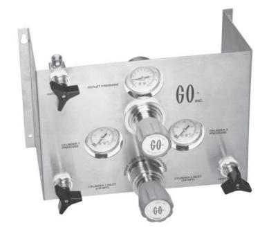 - system zintegrowanych reduktorów jednostopniowych: główny i drugorzędy serii PR1, działających naprzemiennie, z jednym przyłączem wyjściowym;gwarantujący stałe, niezmienne ciśnienie, nawet podczas wymiany opróżnionych źródeł gazu; na panelu montażowym; w opcji z manometrami, zaworem odcinającym, filtrami 20μm, oraz etykietami na listwie ułatwiającymi identyfikację portów i manometrów