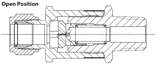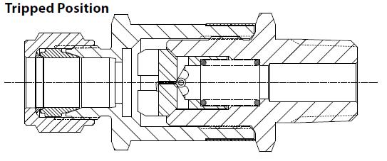 Grzybek pozostaje w pozycji „zamknięty”. Port odpowietrzający w grzybku umożliwi wyrównanie ciśnień w zaworze, a sprężyna zresetuje zawór ustawiając grzybek w pozycji „otwarty” umożliwiając ponownie swobodny przepływ medium.